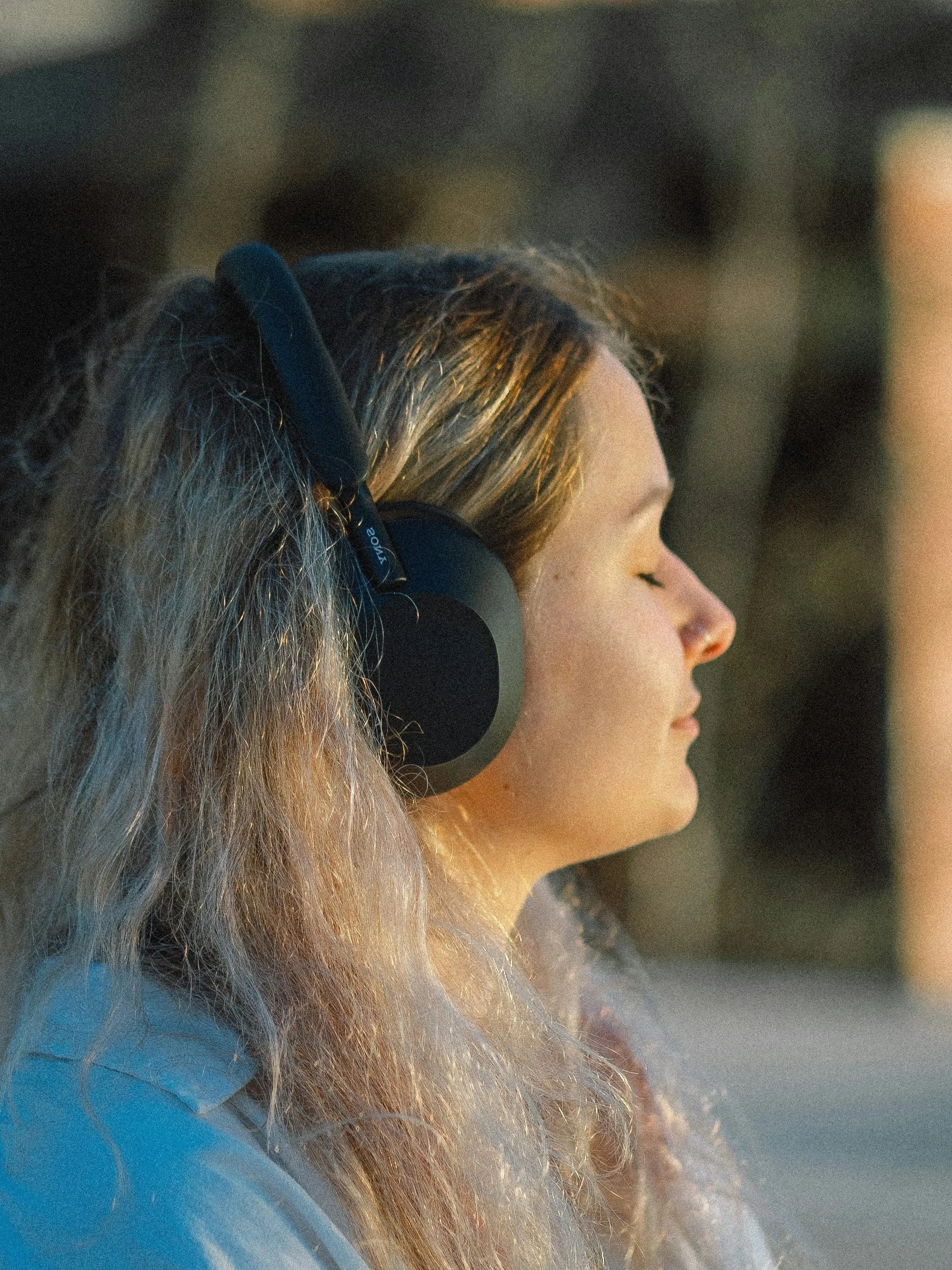 Frau trägt Kopfhörer mit geschlossenen Augen, entspannt im Sonnenlicht